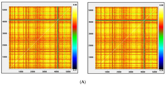 (A) Recurrence plot for the returns and ARMA series from the Nikkei index; (B) Recurrence plot for the GARCH and EGARCH series from the Nikkei Index.