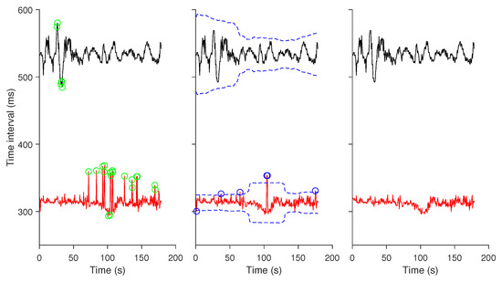 A non-stationary trend of ≤ 0.04 Hz was removed from each RR and QT time series using a wavelet decomposition-based algorithm [24]. Anomalous intervals manifested as spikes in the time series due to either false negatives or false positives during the R-peak detection or caused by erratic compressing/stretching during the QT intervals extraction were sporadically seen. To diminish the effect of these spikes on entropy analysis, we applied a two-step procedure to minimize them (see Figure 2). In the first step, an impulse rejection filtering was performed with spikes identified being replaced by the median value of surrounding five samples [25] (Figure 2 left panel). In the second step, a moving standard deviation with window length of 100 samples was performed and any points that were three standard deviations away from the global mean were removed (Figure 2 middle panel). We should note that in the second step, points identified as spikes in one of two time series (i.e., RR or QT intervals) were removed simultaneously from the other time series. The right panel in Figure 2 shows an example of the final RR and QT intervals time series to be analyzed.