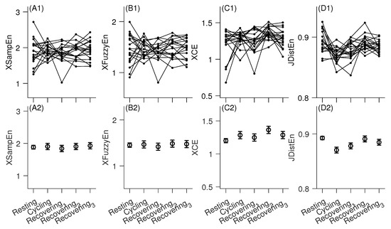 Figure 3 and Table 1 summarize the main results of this study. No statistically significant changes were found in XSampEn, XFuzzyEn, or XCE during different conditions, except that the XCE during recovering phase 2 was significantly greater than that during resting state [; Figure 3(C1); Table 1]. JDistEn demonstrated a decrease during cycling compared with the resting state (; Table 1), and then a recovering increase from cycling to recovering phase 1 ( in post hoc comparison between recovering phase 1 and cycling), and further to phase 2 ( in post hoc comparison between recovering phase 2 and cycling). During recovering phase 2, JDistEn was fully recovered to its level in resting state [ in post hoc comparison between resting and recovering phase 2; Figure 3(D1)].