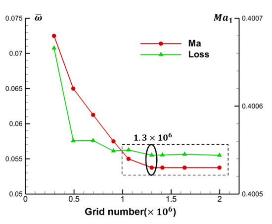 The NUMECA/autogrid5 10.1 is used to mesh the passage of the cascade, and a single channel O4H topology is generated. The butterfly grid technique is used in the real blade tip clearance. According to the reference [19], when the number of clearance nodes exceeds 17, the influence of the number of clearance nodes on the flow field is not obvious. In this paper, 21 grid nodes are given along the radial direction to capture the flow field within the gap. Here, the grid independence is verified to ensure the accuracy of this method. Figure 3 shows the trend of the overall total loss coefficient () and inlet Mach number () with the total number of passage grids. It can be seen that when the total number of grids exceeds 1.06 million, especially 1.3 million, the change of grid number will not have a significant impact on the calculation results. Therefore, the total number of passage grids in the prototype cascade without suction is set to about 1.3 million in this paper.