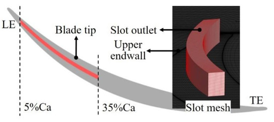 Figure 4 shows the calculation domain setting of the compressor cascade and the calculation grid of the lower endwall and the blade SS under the TCS of 1.0% h, and the local grid enlargement at the leading and trailing edge (LE, TE) of the blade tip is shown. The inlet passage extends to 1.0 axial chord (Ca) upstream of the LE. The outlet passage reaches 1.5 Ca downstream from the TE of the blade. The grid size of the first layer near the solid wall is set to , making the dimensionless parameter , so as to meet the requirements of the turbulence model selected for numerical calculation [24].