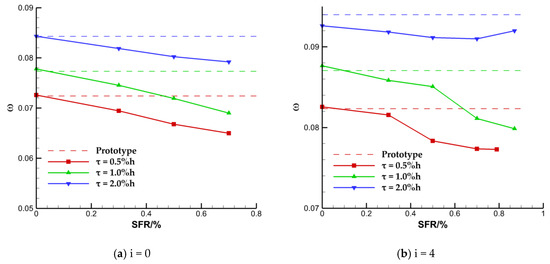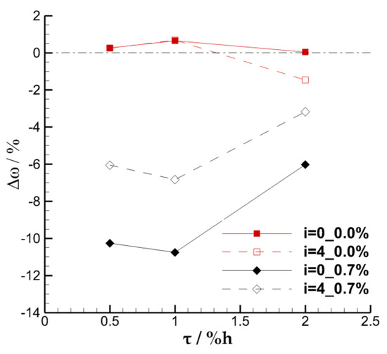 For quantitative explanation, Figure 8 shows the relative change of the overall loss coefficient with the TCS when the SFR is 0.0% and 0.7% at the inflow incidence angles of 0° and 4°, respectively. When the ES scheme is not carried out, the effect of the suction slot on the flow field is similar to that of the casing treatment. The overall loss coefficient is increased slightly due to the interference effect on the flow field in the end area under most cases. However, it is found that the interference effect may also reduce the loss through the investigation of the 4° inflow incidence angle under the TCS of 2.0% h. These two seemingly contradictory results can also be found from the conclusion obtained in the research about the case treatment [25]. For the cases with the SFR of 0.7%, the overall loss coefficients of the cascade with TCS of 0.5% h, 1.0% h, and 2.0% h decrease by approximately 10.3%, 10.8%, and 6.0%, respectively, at 0° incidence angle, and decrease by approximately 6.0%, 6.8%, and 3.2%, respectively, at 4° incidence angle. Combined with the above analysis, it can be preliminarily concluded that the endwall suction scheme adopted in this paper has a better effect on improving the overall performance of the cascade of which the TCS is 0.5% h and 1.0% h. However, the effect of modifying the flow field in the large clearance of 2.0% h is the worst of the three TCS schemes.