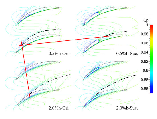 Next, the effect of TCS on tip leakage control by the ES scheme was studied with the TCS schemes of 0.5% h and 2.0% h, respectively, under the condition of inlet Mach number of 0.4 and incidence angle of 0°. Figure 9 shows the static pressure coefficient distribution on the upper endwall of the prototype and suction schemes under two clearance sizes. The black dot line starting from the minimum static pressure point in the figure is the line of the static pressure chute, which is used to represent the movement trajectory of TLV [5,26]. The onset position of the TLV of the cascade with the TCS of 0.5% h and 2.0% h is located at approximately 15% Ca and 28% Ca, respectively, that is to say, with the increase of the TCS, the onset position of the TLV moves downstream. In addition, with the increase of the TCS, the trajectory of the TLV deviates away from the blade SS as well as the strength and influence range of the TLV increase. After suction, the onset point of the TLV corresponding to the small clearance moves downstream to ~48% Ca, and the influence of TLV on the flow field is obviously weakened. The ES scheme does not change the onset position of the TLV corresponding to the large clearance, only makes its trajectory slightly close to the blade SS. Moreover, looking at the distribution of the static pressure coefficient near the cover position of the slot, the ES scheme almost affects the thickness of the whole blade under the small clearance. Nevertheless, the influence range of the suction slot under the large clearance is only limited to its own cover region, which also leads to the small influence of the ES scheme on the trajectory of the TLV under the large clearance.