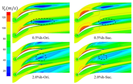 Axial velocity distributions at 97% span. The area of low speed zone caused by leakage flow is obviously reduced due to suction, and the region moves downstream under the small clearance with suction.