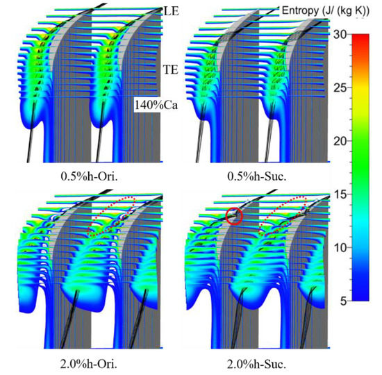 Figure 11 shows the entropy distribution of the tip region on 15 axial slices from the blade LE to 140% Ca under various conditions, and some three-dimensional leakage streamline is added. The high entropy region near the blade SS in the figure is the region affected by the TLV. In the process of downstream development, the region expands gradually, whereas the peak value of the entropy decreases. For the ES scheme compared with the prototype, the high entropy region caused by the TLV moves towards the blade SS and the area is reduced, and the entropy value is also reduced to a certain extent. It is indicated that the ES scheme can modify the tip flow field by directly weakening the strength and influence range of the TLV. The position where the area of the high entropy began to expand in the small clearance moves obviously to the blade TE after aspiration, which corresponds to the movement of the onset position of the TLV. This is consistent with the onset position of the TLV, which has no change with or without suction under the large clearance scheme; the position where the high entropy region began to expand has no obvious change, too. A much smaller region of high entropy adjacent to the TLV is caused by the passage vortex (PV), which is shown in the lower two figures as a red dotted ellipse.