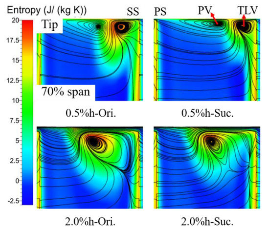 To further illustrate the influence of TCS on the suction effect, Figure 12 shows the entropy and two-dimensional streamlines distribution from 70% blade span to the tip of the S3 slice near the TE of the cascade blade. This slice further confirms the influence of suction on the TLV and PV analyzed in Figure 11. In addition, it can be seen that the core of TLV is farther away from the endwall under the large clearance, and the PV is stretched into an ellipse with the core closer to the upper endwall under the small clearance after suction. Compared with the area where entropy value is more than 10 (mainly represented in green, yellow and red), the area corresponding to the TCS of 0.5% h with suction is almost reduced to half of the original, and is limited to the upper endwall corner, thus greatly reducing the blockage of the tip passage. The area corresponding to the TCS of 2.0% h is only reduced by about 20%. According to the analysis of Figure 9 and Figure 12, the difference of suction effect under the small and large clearance is mainly caused by the difference of change degree before and after suction, including the onset position and influence range of the TLV. The reason for the different degree of change is that the distance between the core of the TLV and the endwall is different. That is to say, the distance between the suction slot and the TLV increases with the large gap, and less fluid that originally located in the core of the TLV was sucked in the same SFR, which results in the weakening of the control ability of the suction slot to the TLV and the ability to modify the flow field.