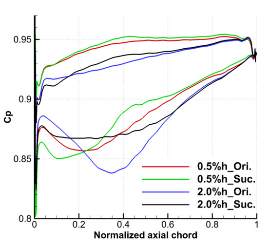 Figure 14 shows the static pressure coefficient distribution at 97% blade span under the prototype and suction conditions with two TCS. One can see that the pressure distribution on the SS of the suction slot coverage and nearby area were changed obviously by slotting along the flow direction on the upper endwall, and also has a certain impact on the pressure distribution of the blade PS, thus affecting the distribution of the blade tip load. For the condition with the TCS of 0.5% h, the static pressure coefficient of the SS from the LE of the blade to 23% Ca decreases after suction, and the blade load increases, which is caused by the local acceleration effect of the TLF due to the suction. After that, in the range of 23 to 65% Ca, the static pressure coefficient of the blade SS increases, the blade tip load decreases obviously, the blocking effect and the TLF intensity are weakened, which is the same as the conclusion observed in Figure 11. This range has also become the main action area of the suction scheme used in current study to control TLF. Besides, the decrease of the TLF intensity and the attenuation of the TLV make the static pressure coefficient of the blade PS increase in small range.