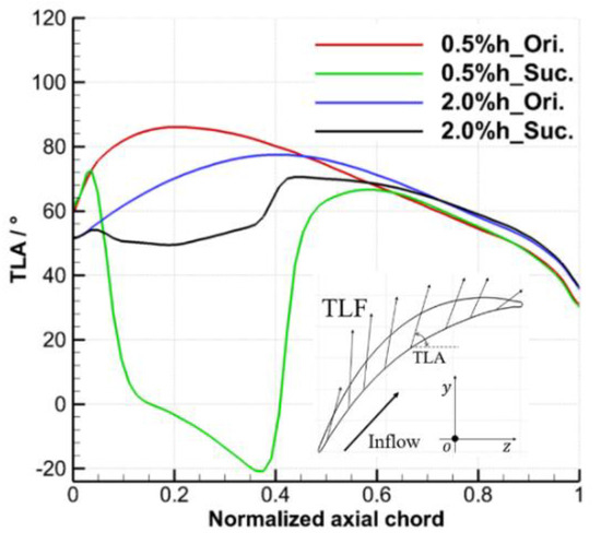 According to the work in [23], the angle between the TLF at the gap exit and the core flow can be selected to evaluate the intensity of local TLF. Therefore, Figure 15 shows the distribution of the tip leakage flow angle (TLA, defined as the angle between the leakage flow and the axial direction) at the mid-gap exit. For the prototype cascade without suction, the TLA increases first and then decreases from the LE to the TE of the blade. The axial position of the maximum TLA coincides with the position of the maximum tip load in Figure 14, and the position under large clearance is closer to the downstream and the amplitude of the maximum TLA is smaller than that under small clearance. For the case under the TCS of 0.5% h, the TLA under the suction condition is greatly reduced in the range of 4 to 62% Ca, the TLA is negative even in the range of 15 to 40% Ca, and part of TLF backflow occurs. In other ranges, the TLA is basically unchanged. The decrease of TLA indicates that the ES scheme reduces the velocity of the TLF and reduces the intensity of the TLF and TLV. For the case under the TCS of 2.0% h, the ES scheme reduces the TLA of the prototype cascade in the range of 3 to 70% Ca, and the effect on the TLA in other ranges is negligible.