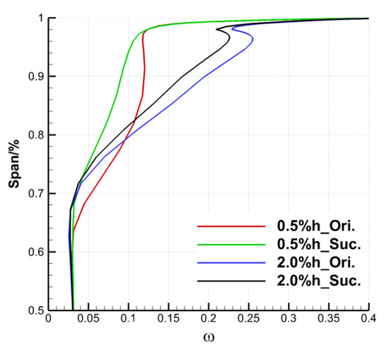Finally, the effect of the ES scheme on the cascade outlet by controlling the TLF is analyzed quantitatively. Figure 16 and Figure 17, respectively, show the distribution of the pitch averaged total pressure loss coefficient and the outlet flow angle along the spanwise direction. As the suction on the upper endwall of the cascade does not affect the flow of the lower half, only the parameter distribution of the area above 50% blade span is given here. In Figure 16, the relative blade height at the beginning of loss growth under large clearance is closer to the endwall than that under small clearance, which is caused by the fact that the TLV under the large clearance has a more backward onset position and a smaller spreading range along the spanwise. The suction did not change the distribution rule of the total pressure loss coefficient along the spanwise. It mainly reduced the total pressure loss coefficient of cascade outlet in the range of 64 to 98% blade span under the TCS of 0.5% h, and 70–99% blade span under the TCS of 2.0% h. With the same SFR, both the spanwise range and the degree of loss reduction under the small clearance are larger than that under the large clearance, which corresponds to the initial analysis of the overall total pressure loss coefficient.