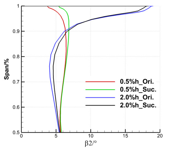The outlet flow over deflects near the upper endwall under the small clearance, whereas that under deflects near the upper endwall and over deflects near 80% blade span under the large clearance. The suction also does not change the distribution rule of the outlet flow angle along the spanwise direction in Figure 17, but has different influence on the change of the outlet flow angle under the two tip clearance sizes. The outlet flow angle of the TCS of 0.5% h with suction increases above 75% blade span. The growth rate of outlet flow angle gradually increases with the blade height, and the maximum increase is obtained at the endwall. The increase of the outlet flow angle due to aspiration effectively improves the over deflection phenomenon of the outlet flow at the endwall. The outlet flow angle of the cascade with the TCS of 2.0% h after suction increases below 93% span, but decreases above 96% span. The ES scheme improves the over deflection near 80% blade span and the under deflection near the upper endwall of the outlet flow under the large clearance, which reduces the overall outlet loss and improves the aerodynamic performance of the cascade. The positive effects of the ES scheme in controlling the TLF and modifying the tip flow field are also different due to the difference of the outlet flow angle distribution between the two clearance sizes.