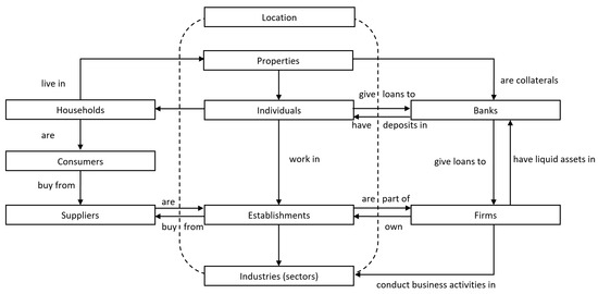 In the macro-finance model, 9 agents are distinguished: Banks, Individuals, Households, Consumers, Firms, Establishments, Suppliers, Properties and Industries. All Parameters in a separate object are also defined. The relations between agents in the model are presented in the Figure 1. The attributes of the agents can be found in the Table A1, Table A2, Table A3, Table A4, Table A5, Table A6, Table A7, Table A8, Table A9 and Table A10 in the Appendix A.