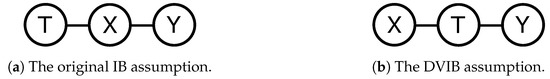 Let us now focus again on the motivation for the assumption in Equation (4). It prevents the model from choosing a degenerate solution of (in which case and ). Note, however, that while is a sufficient condition for such a solution to be excluded (which justifies the correctness of the original IB), the necessary condition is that T cannot depend directly on Y. This means that the IB Markov assumption can be indeed reduced to requiring the absence of a direct arrow from Y to T in the underlying DAG. Note that this can be achieved in the undirected model too. One thus wishes to avoid degenerate solutions which impair the bottleneck nature of T: it should contain information about both X and Y, the trade-off between them being steered by . It is therefore necessary to exclude DAG structures which encode independence of X and T as well as Y and T. Such independences are achieved by collider structures (with two different variables pointing towards a common child) in DAGs; i.e., and (they lead to degenerate solutions of and , respectively). To sum up, the goal of asserting the conditional independence assumption in Equation (4) is to avoid degenerate solutions which impair the bottleneck nature of the representation T. When modelling the information bottleneck with DAG structures, one has to exclude the arrow and collider structures. A simple enumeration of the possible DAG models for the information bottleneck results in 10 distinct models listed in Table 1.