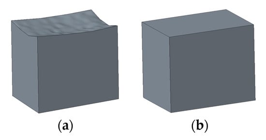 The stress distribution evaluation method and the corresponding optimization method proposed in this paper are based on the geometric error modeling. In terms of geometrical error modeling of parts, most studies only consider the statistical tolerance and deviation [,,,,], which cannot reflect the real geometric errors of parts. Zhongqing Zhang [] presents a modeling method of a solid model with real geometric error surfaces in CAD, as shown in Figure 1. In this paper, on the basis of this modeling method, the solid model with real geometric error surfaces of the parts is built, assembled, and imported into the finite element software.