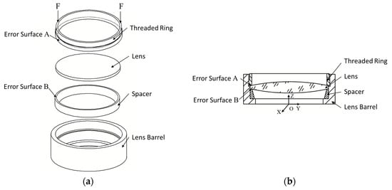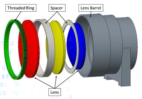 In this paper, an optical lens system is taken as the research object. An optical lens system is an essential part of machine vision systems, which is mainly composed of a lens barrel, spacers, lenses, and a threaded ring. A typical optical lens system structure is shown in Figure 2, and the parts’ functions are shown in Table 1. The magnitude and distribution of stress are important performance indexes of a lens. The existence of stress seriously damages the imaging quality of optical lens elements. In the case of machining, heat treatment, and improper installation during production, the internal stress of lens will occur []. The non-uniform stress will reduce the optical uniformity of the lens, resulting in the inconsistent distribution of refractivity []. In serious cases, it may cause optical failure due to poor imaging quality. Annealing stress also has an important influence on the imaging quality of optical system [].