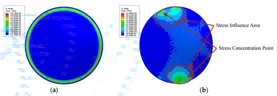 In order to explain the difference of stress distribution between error model and ideal model, the contact between a spacer and an optical lens in the optical lens system is taken as an example. The lens is an ideal model. In order to illustrate the stress distribution characteristics of the lens, the von Mises stress nephogram of the lens surface calculated with finite element software is shown in Figure 3, and the setting of finite element parameters is shown in Section 3. If the spacer is an ideal part, the contact with the lens will be uniform. The stress is evenly distributed in the circular direction of the lens, and in the radial direction of the lens, the stress decreases from the direct contact ring area to the center of circle, as shown in Figure 3a. If there is a geometric error surface on the spacer, the lens will not be able to contact evenly and will result in local stress concentration, as shown in Figure 3b. The stress change curve of lens radial direction of the ideal model and the error model is shown in Figure 4. The stress distribution curve of the ideal model lens in any radius direction is almost the same; the error model lens has different stress distribution curves in different radius directions. The stress of error model is greater than that of ideal model as a whole.