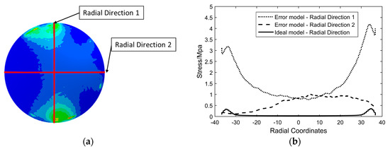 (a) Stress nephogram of an error model. (b) Radial stress curves of error model and ideal model.