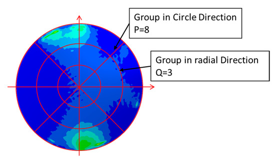 Thirdly, the SED concentration elements which have been divided into M groups are grouped again into P*Q groups according to their positions. The lens is divided evenly into P sector regions along the circular direction, and then into Q ring regions along the radius direction. There are P*Q regions in total. The schematic diagram of lens region division is shown in Figure 7.