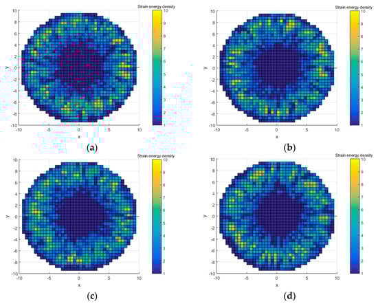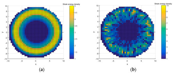 A few simple cases are used to explain the relative entropy evaluation method of SED distribution. Elements of the model are replaced by points in cases. X and Y coordinates represent the positions of elements, and Z coordinates represent the SED of the elements. The position and SED are settled according to the stress change pattern of the ideal model and the error model in Figure 4b. The Z coordinate is displayed by the color bar, as shown in Figure 8. Figure 8a is the ideal case, and Figure 8b is an error case 1 which Z coordinate (SED) is random. It should be emphasized that the random cases cannot be completely equivalent to the results of finite element calculation. Since the stress and SED between adjacent elements are interrelated in the finite element calculation results, there is no such correlation in the random points. Therefore, this case only concerns the similarity between the error model and the ideal model and the verification of the relative entropy calculation method.
