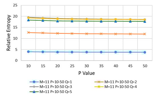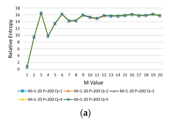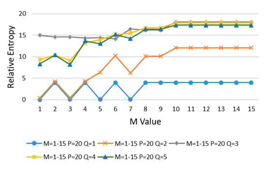 In order to determine the best values of divided regions, M, P, and Q in error case 1 are increased, and the relative entropy is calculated in turn. First, the value of M is increased, the initial value of P (P = 20) is kept unchanged, and then Q is increased from 1 to 5 for calculation, as shown in Figure 9.