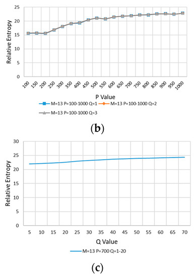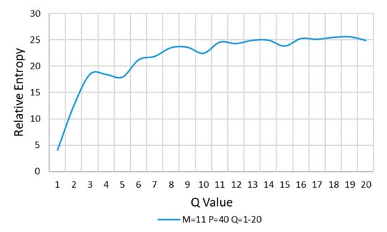 In Figure 11, with the increasing of Q, the relative entropy increases gradually and reaches stability after Q > 10, and Q = 12 is taken at the stable position of curve change. Thus far, the values of M, P, and Q are completed:
