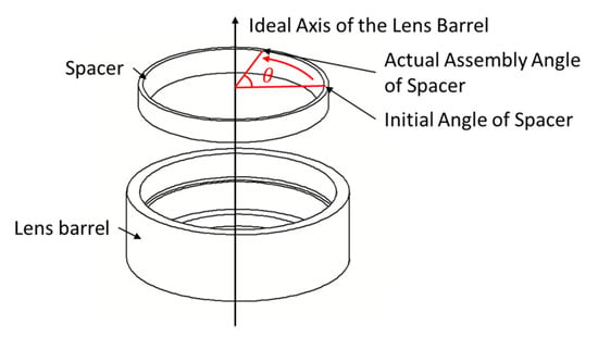 The magnitude and distribution of stress are important performance indexes of the lens. However, in traditional tolerance analysis, a revolving body is regarded as a part with macro tolerance. Its assembly angle does not have any impact on the accuracy of the optical lens system, and there is no need to optimize it. Taking the typical optical lens system shown in Figure 2 as an example, the spacer assembly angle θ is defined as the difference between initial angle of spacer and the actual assembly angle (taking the ideal axis of the lens barrel as the axis), as shown in Figure 13.