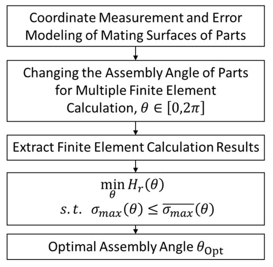 The optimization process is shown in Figure 14. Firstly, the measurement and error modeling of the mating surfaces of the parts are carried out, and the three-dimensional model with real errors is established []. Then, the error model is imported into the finite element software. The assembly angle of parts is changed for multiple calculations. The position coordinates, SED of elements and the maximum stress of the model are extracted from the calculation results. The optimal result is the assembly angle whose relative entropy is minimum and maximum stress is less than the average.