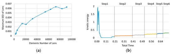The models of the spacer and the threaded ring with geometric errors are assembled with an ideal lens and lens barrel, and then imported into the finite element software for mesh generation, boundary condition setting and load application. The finite element parameters are shown in Table 4. The explicit solver is chosen. Since, in the implicit solver, each model needs to be adjusted separately to achieve convergence, and the parameter settings might be slightly different, which leads to the decrease of the comparability of the calculation results. The elements number in a mechanical contact problem is vital for the results. Some studies performed sensitivity analysis to adjust their finite element models [,]. The sensitivity analysis of elements number is carried out and the result is shown in Figure 17a. Considering the stability of the results, 83,136 elements are chosen. Only the elasticity of materials is considered, not plasticity. Since the maximum stress in the results is not more than 50 MPa, which is far lower than the plasticity of 7075 aluminum alloy (about 455 MPa). The maximum stress of the lens is not more than 11 MPa, which is far lower than the breaking point of glass H-ZK10. After the investigation in the early stage, the empirical preload of the threaded ring is 150 ± 50 N. Therefore, the preload is set to 150 N, which remains unchanged in the whole optimization process. The error surface is measured by 60 measuring points per circle, that is, measured every 6°. Considering the measuring points distance and computer calculation ability, 20° is selected as the minimum variation of assembly angle of the spacer. In the finite element software, the ideal axis of the lens barrel in Figure 13 is taken as the rotation axis, and the spacer is rotated every 20° to obtain a total of 18 error models with different angles from 0° to 340°. At the same time, an ideal model without error surfaces is established in the same way. All the finite element models are calculated, and the SED, element coordinates, and element stress of the lens are obtained.