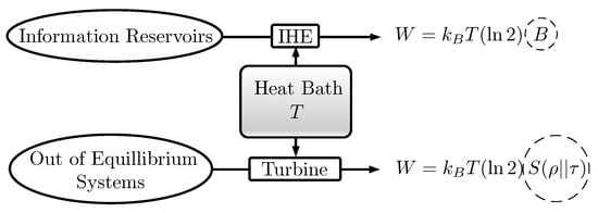 Physical systems in a state out of thermal equilibrium also allow the production of work. It turns out to be related to the relative entropy with respect to the equilibrium state , again an informational quantity (in this paper, always represents the binary logarithm of x). Appendix B contains a short derivation of this result. Some recent reviews compile a variety of properties and functional descriptions of relative entropy [39,40,41,42]. Probably, the most closely connected to this paper is its interpretation as the average extra number of bits that are employed when a code optimized for a given probabilistic distribution of words is used for some other. This paper contributes a new procedure that also reveals a direct connection between the relative entropy of physical systems and information reservoirs circumventing Thermodynamics. It focuses on the quantum case, particularly when the relative entropy is defined for non-commuting density matrices.