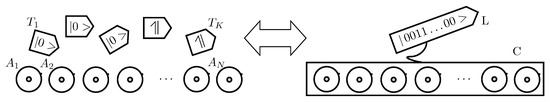 Labeling an N-atoms cluster C in state means applying the unitary operator to the cluster and a label of H tagging qubits in a state, as is depicted in Figure 3. When is diagonal in the basis, the operation is equivalent to the classical operation of coding according to the Shannon method and storing the codeword in the label. The resulting state is a classical statistical mixture of cluster–label pairs.