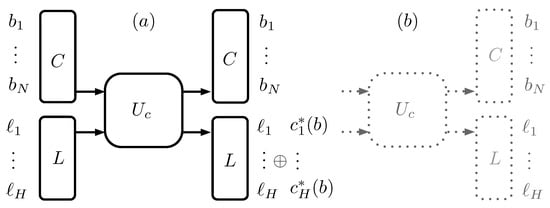 (a) represents the coding procedure as a unitary operation , controlled by the cluster C, on the tagging qubits of the label L. If the tagging qubits are initially in a state, they hold the coded string for the cluster; (b) represents the inverse operation, which is equal to , so that is the identity transformation.