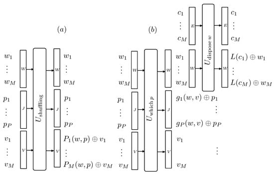 In this appendix, we explain how the shuffling of labels depicted in Figure 5 can be implemented by a unitary transformation. We have split the process into three operations, performed by the unitary gates and . The first gate operates on three groups of tagging qubits: are collections of M labels and J is a collection of P qubits, where P is equal to . Initially, W contains the labels generated for a group E of M clusters; all the tagging qubits in V are in a state and all the qubits in J are in a maximally mixed state. The gate writes in V the values in W according to the p-th permutation of the labels . The value of p is read from the random group J. The unnecessary trailing qubits of each label are then trimmed according to the procedure described in Appendix C.