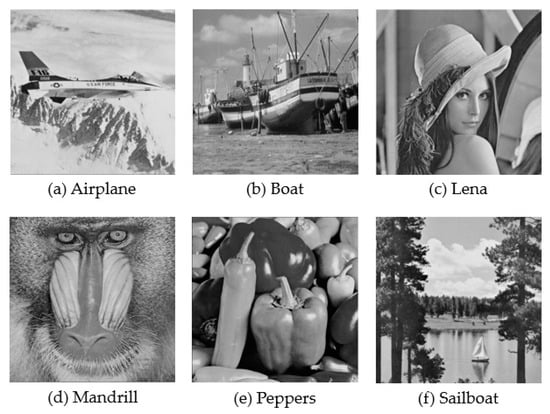 Some experimental cover images were tested to demonstrate the efficiency of the proposed scheme. In the experiments, the proposed scheme was verified using the following six test cover images: airplane, boat, lena, mandrill, peppers, and sailboat. As shown in Figure 4, all the images had the same size of 512 × 512 pixels with 256 grayscales, and the features of the images were diverse. The block size of the image presented in the AMBTC format was 4 × 4 pixels. A random binary sequence generated using a MATLAB (R2018a) function was used in the experiments as the secret sequence, where our secret data are the same as the secret data of the related works [,,,]. Note that each bit in the sequence has equal probability of being 0 or 1.