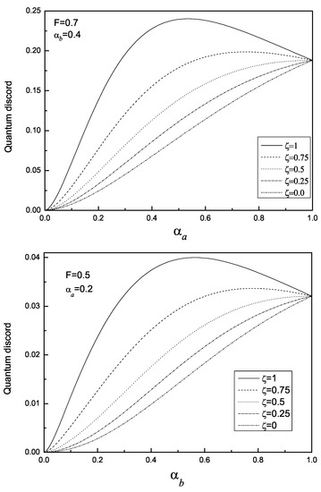 (ii) For given , F, and , monotonically increases with and reaches its maxima at (See Figure 2). However, for given , F, and , first increases then decreases with , and the transition point is determined by the exact value of . As for the case of , one can find that the dependent relation of on for given , F and is similar to that on . This feature is related to the LQCC operation and its underlying physics can be explained as follows. The LQCC operation is concerned with two parties, Alice and Bob, who each control one subsystem, and who are restricted to carrying out local quantum operations and classical communication (i.e., LQCC). Specifically, the quantum operations Alice and Bob are allowed to perform are local unitary transformations and local filtrations. As analyzed in the second section in this paper, to calculate the quantum discord in the WLQCC state in Equation (2), we have considered the kernel state in Equation (5) instead. From Equation (5), one can see that is the parameter characterizing the filtration operator , is the one for , and is the one for the unitary operator .