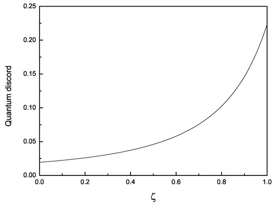 (iii) Through analysis, one can find that quantum discord is a monotonically increasing function of for given , , and F. See Figure 3 for example. is the parameter used to characterize the unitary operation . In addition, according to the expression of quantum discords in WLQCC states, the parameter vanishes when or . Especially, in the situation of , LQCC is turned into local unitary operation, which does not change the quantum discords in Werner states. When or , the total correlations of WLQCC states are zero. The special case is meaningless for the matrix form of WLQCC states is zero.