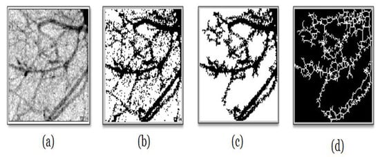 Figure 1. Step by Step of the digital processing make to the BMP image to obtain a binary skeletonized form: (a) image in gray scale, (b) Image in binary form, (c) Segmentation procedure, (d) Skeletonized binary form.It is worthwhile to mention that the skeletonized binary form is a 2D representation of the vascular network, this means that we only have 8 possible neighbors with respect to one single node. This apparently limitation can be overcome considering a 3D model and developing the same steps as those mentioned above. In recent years there have appear other models trying to resemble this process [20,21,22].