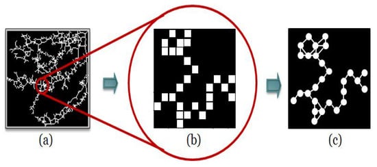 Modeling the complex network (a) binary skeletonized form. (b) Zoom of one part of the skeletonized binary form pixel by pixel (c) Network obtained after the assignation of nodes and edges to each pixel.