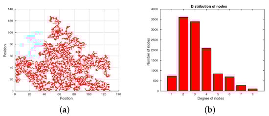 Example of a single network (with a size of 128 × 128 cells) generated by ARGA algorithm. (a) Network generated by the algorithm. (b) Distribution of nodes generated by the same algorithm