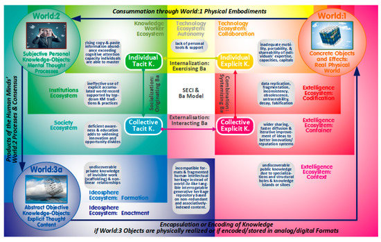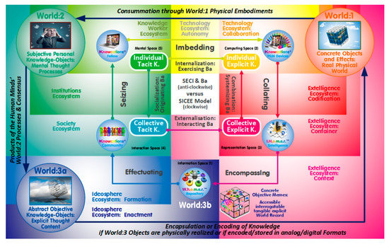 Accordingly, Popper’s world:3a accumulates crystallized imaginations of the world:2’s human minds as abstract explicated master copies (of original and/or mutated knowledge objects) irrespective of their concrete embodiment(s) as physical world:1 object(s). By complementing the subjective tacit world:2 mental personal thought processes with the abstract explicit world:3a objective content perspective, Popper divorces the creator from his/her message which—to become accessible and elicit impact—still needs to be resourcefully combined and physically encapsulated (or encoded) in concrete physical objects to transform the concrete world:1 environment (or other world:2 minds) in order to potentially yield further world:3a objects and/or relationships [17]. World:3a, thus, is just a philosophical construct bridging the minds and physical worlds only metaphorically.
