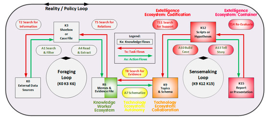 It also partially integrates a further knowledge creation model included in three-dimensional map mentioned earlier [21]: Pirolli and Card’s cognitive-task-related notional model of the sensemaking loop for intelligence analysis [42] which focusses on individuals’ work by integrating a foraging and sensemaking loop under the umbrella of a reality/policy loop. It correlates with five of the ecosystems as shown in Figure 3 and as explicated in the following sections.