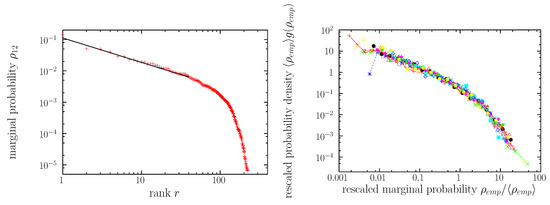 Empirical two-letter marginal distributions (for word length not larger than 6 letters). Left: The distribution is represented in terms of the rank-frequency plot [corresponding to Equation (11)]. The most common values of correspond to the following pairs: th, an, of, to, he, in, a□, ha, wh, wa, … The power-law fit from Table 1 is shown as a straight line, with exponent . Right: All 15 two-letter marginals are represented in terms of the distributions of the value of the marginal probabilities, (denoted in general as ). All the distributions have been shifted (in log-scale) by rescaling by their mean values , see [70]. This makes apparent the similarities between all the two-letter marginal distributions, except for a scale factor given by . Values below the mean () can be fitted by a truncated power law, with exponent (not reported in the tables). The tail (large ) is well fitted by power laws, with the values of exponents in Table 1.
