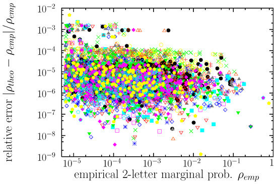 Comparison between the empirical two-letter marginal distributions and the theoretical ones obtained from the improved iterative-scaling optimization procedure [61,62]. The relative error between both values of the marginal probability is shown as a function of the empirical value, for the 15 marginals.