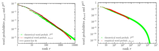 In Figure 3 we also display the theoretical result, , Equation (8), arising from the solution of Equation (10). We see that, qualitatively, has a shape rather similar to the empirical one. Both distributions fulfill Zipf’s law, with exponents equal to 0.89 and 0.81, respectively. We also see in the figure that the quantitative agreement in the values of the probability ( and ) is rather good for the smallest values of the rank (); however, both curves start to slightly depart from each other for . In addition, the rank values are associated with the same word types for (the, of, and, to, a, in), but for larger ranks the correspondence may be different ( corresponds to i in one case and to that in the other). If we could represent and in six dimensions (instead that as a function of the rank) we would see more clearly the differences between both.