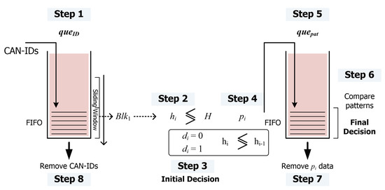 - Generate an i-th block, , by accumulating CAN-IDs of the sequentially generated frames into the queue of CAN-IDs, , where is the size of a block.