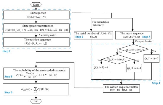 The main reason for the above two problems is that it is too rough to calculate the probability only using the permutation pattern as the partitioning criterion in PE algorithm. In Reference [25], He et al. proposed a concept which has the intention of secondary partitioning, and they applied their idea in the multivariate system and presented multivariate permutation entropy (MvPE). In their concept, each permutation pattern in PE is divided into three sub-patterns according to where the intermediate element is. However, MvPE is used to measure the complexity of multivariate systems for embedding dimension m = 3 , and some difficulties prevent its application when m > 3 . In this paper, we make a secondary partitioning, which improving the accuracy of partitioning based on permutation pattern and overcoming the incompatibility of MvPE algorithm for m, and propose coded permutation entropy (CPE).