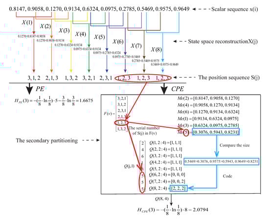 Based on the above statements about CPE, the flow chart of CPE algorithm is shown in Figure 1. A simple example is presented to illustrate the calculation processes of PE and CPE as shown in Figure 2. The scalar sequence { x ( i ) } of this example is {0.8147, 0.9058, 0.1270, 0.9134, 0.6324, 0.0975, 0.2785, 0.5469, 0.9575, 0.9649} which is the random number drawn from the standard normal distribution. In Figure 2, the position sequence ‘1, 2, 3’ is the fifth in the permutation pattern of m = 3 , and so we set Q ( j , 1 ) = 5 when j = 6 , 7 , 8 which is shown in the bold red line of Figure 2. Due to the reconstructed component X ( 6 ) , X ( 7 ) and X ( 8 ) have the same position sequence ‘1, 2, 3’, the corresponding mean sequence can be recorded by calculating the mean of X ( 6 ) , X ( 7 ) , X ( 8 ) , namely M e ( 5 ) = [ 0.3076 , 0.5943 , 0.8231 ] . Then we compare the size between X ( 6 ) , X ( 7 ) , X ( 8 ) and M e ( 5 ) respectively, and get the coded sequences Q ( 6 , 2 : 4 ) , Q ( 7 , 2 : 4 ) and Q ( 8 , 2 : 4 ) (we only present the specific process of obtaining Q ( 8 , 2 : 4 ) as shown in the bold blue line of Figure 2, and Q ( 8 , 2 : 4 ) = [ 2 , 2 , 2 ] means the value of column 2 through 4 of row 8 in matrix Q(8,4) is 2, 2 and 2, respectively). It is clear that CPE successfully divides the reconstructed component X ( 6 ) , X ( 7 ) , X ( 8 ) into three classes by the process of the secondary partitioning which is circled by a black box in Figure 2. In particular, CPE will degenerate to PE when the probability P ( r ) in Equation (6) is presented by the frequency of the same serial number in Q ( j , 1 ) according to Figure 1 and Figure 2. The same procedures can be used to achieve the secondary partitioning for m > 3 .