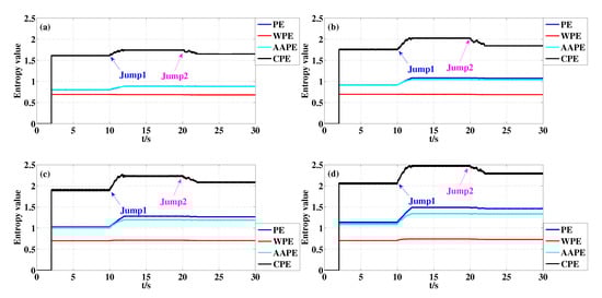 Figure 4a–d show the detection results of PE, WPE, AAPE and CPE for the above time series y ( t ) when m = 3 , τ = 1 , m = 4 , τ = 1 , m = 5 , τ = 1 and m = 6 , τ = 1 , respectively (The value of parameter A existing in AAPE algorithm is 0.5 in all experiments in this paper). A 2000-sample sliding window with the increment of 1 is used in this computation. From Figure 4, we see that the entropy values of PE, WPE, AAPE and CPE increase suddenly at t = 10 s (Jump1), and then it decrease at t = 20 s (Jump2). The reason is that y ( t ) is more complex between 10 s and 20 s, so the corresponding entropy value is larger than those of 0 s–10 s. The only difference for y ( t ) between 10 s–20 s and 20 s–30 s is the amplitude which cause the decrease of entropy value at t = 20 s. Whatever m are, the jumps of CPE are the most obvious among than PE, WPE, and AAPE not only for t = 10 s but also for t = 20 s. Moreover, the Std and the jumps of entropy value of PE, WPE, AAPE and CPE for synthetic signal y ( t ) when m takes on different values are recorded in Table 1. It is clear to find that the Std and the jumps of CPE are the largest in these four algorithms whatever m are. These two aspects indicate that CPE algorithm has some advantages not only for the complexity dynamical change detection but also for the amplitude.