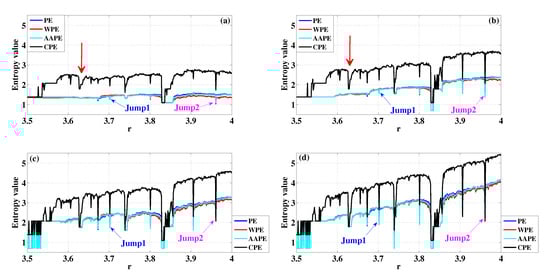 Table 2. The jumps when r = 3.702 (Jump1) and r = 3.961 (Jump2), and the Std of PE, WPE, AAPE, and CPE for the logistic map in different m. Jump1 is equal to the entropy value when r = 3.701 minus those when r = 3.702 , and Jump2 is equal to the entropy value when r = 3.96 minus those when r = 3.961 .