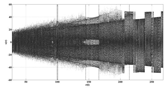 The system is solved using a fourth-order Runge–Kutta method with a time step Δ t = 0.01 . In our simulation, x ( 0 ) = 1 , y ( 0 ) = 0 , z ( 0 ) = 1 , r ( 0 ) = 28 and r ( t ) increases to r ( t ) = 268 by a step of 0.2. For each r ( t ) , we obtain a series with a length of 3000. It is consistent with the logistic map that we only take the last 2000 data to calculate the entropy, and the transient Lorenz map is shown in Figure 7. Theoretically, there are three periodic windows, which existing in 99.524 < r ( t ) < 100.795 , 145 < r ( t ) < 166 and r ( t ) > 214.4 , as indicated by dashed vertical lines in Figure 7 [32].