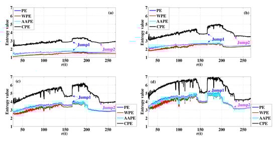 The choices of both m and τ are related to the time step Δ t . Based on this point, we set m = 3 , τ = 10 , m = 4 , τ = 10 , m = 5 , τ = 10 and m = 6 , τ = 10 [32], and the corresponding entropy value curves are presented in Figure 8a–d, respectively. It is consistent with the logistic map that PE, WPE and AAPE have similar detection results when a periodic window appears in the transient Lorenz map. According to Figure 8, we observe that all these curves of CPE capture the periodic windows at r ( n ) = 166 (Jump1) very well whatever m = 3 or m = 4 . The change existing in r ( n ) = 230.4 (Jump2) also can be detected using CPE when m = 4 rather than m = 6 for PE, WPE and AAPE. It is very beneficial for dynamical change detection if we can produce good results when m is small. Furthermore, the corresponding Std and the jumps of CPE also reflect these performances in complexity dynamical change detection, which is recorded in Table 3.