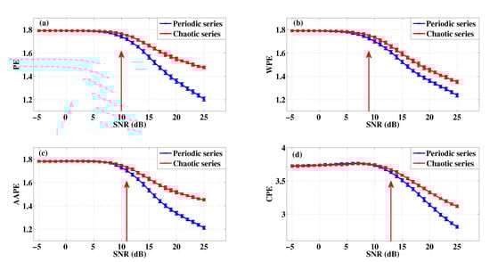 Figure 9. The performance of four algorithms in distinguishing periodic series and chaotic series under different SNR when m = 3 , τ = 1 : (a) PE; (b) WPE; (c) AAPE; (d) CPE.